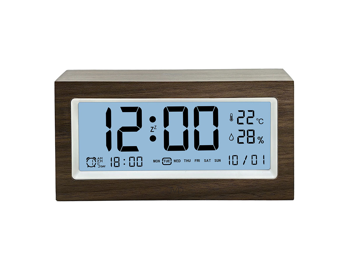 Krásný digitální budík v dekoru dřeva s možností nastavit tři různé budící časy, s opakováním buzení buď od pondělí do pátku, od pondělí do soboty nebo po celý týden. Nechybí odložení buzení, podsvícení displeje, den v týdnu, datum, vlhkost a teplota.