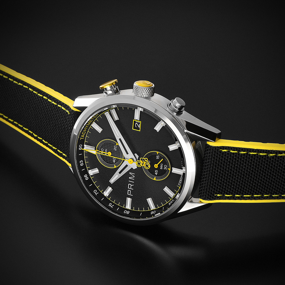 Sportovní hodinky PRIM Cycling W91P.13244.A přinášejí výrazný design a funkčnost do každodenního i aktivního života. Černý ciferník s jemnou strukturou je doplněn kontrastními žlutými prvky – od ruček, chronografů až po lemování datového okénka, což působí svěže, energicky a neotřele.