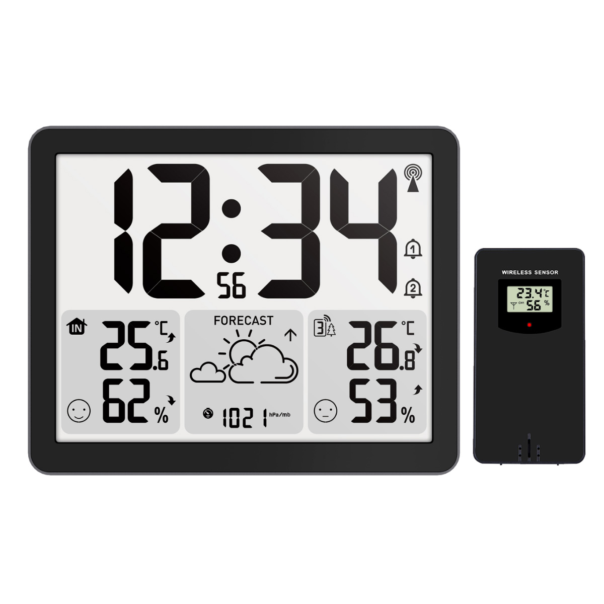 Funkce (slovník): čas řízený rádiem, alarm, opakování buzení (Snooze), barometr, teplota vnitřní, teplota vnější (čidlo nebo kablík), vlhkost vnitřní, vlhkost vnější (čidlo), osvětlení
