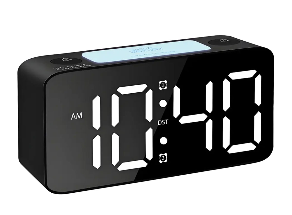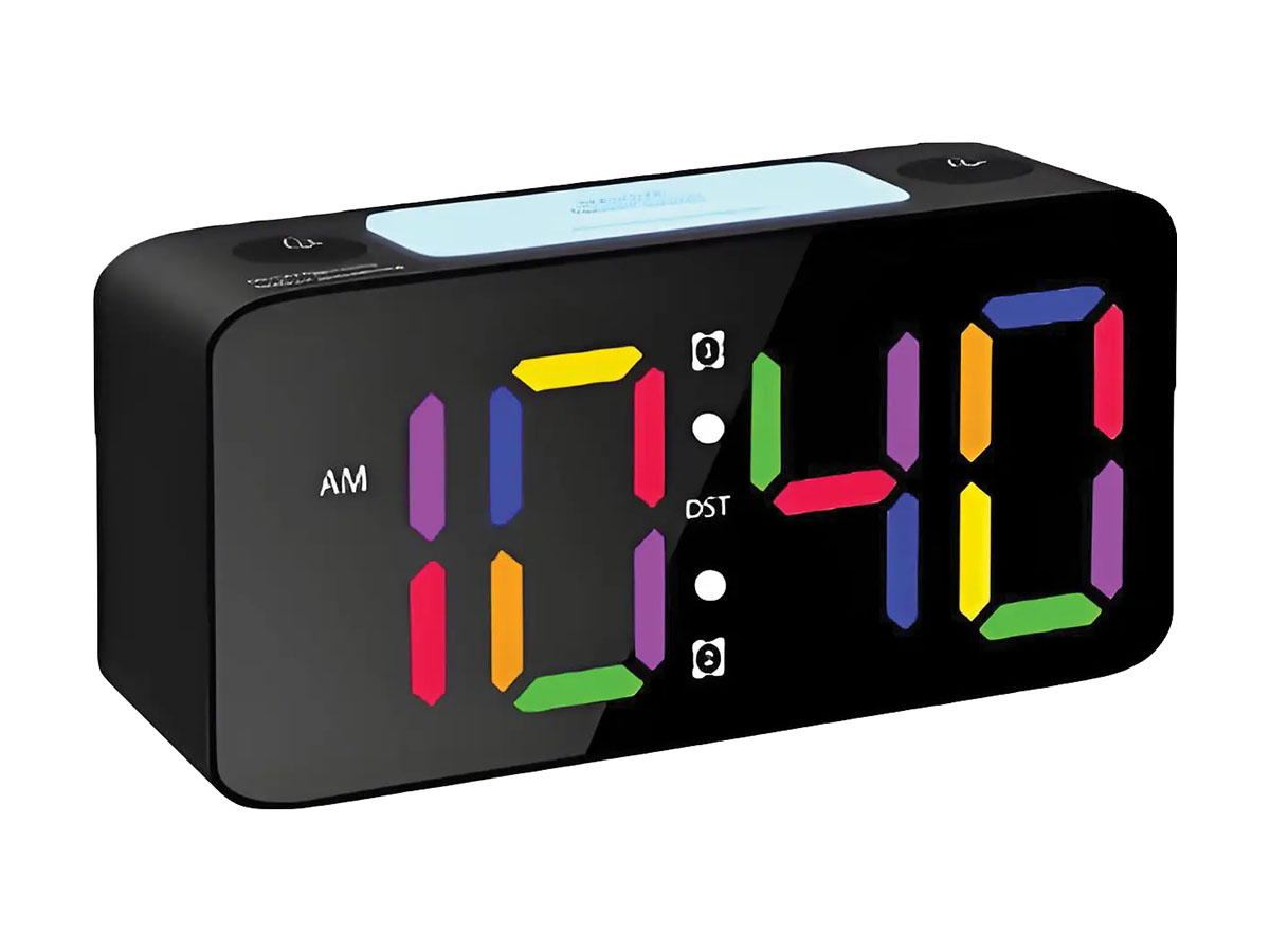 Moderní černý digitální síťový budík s nočním osvětlením, až dvěma budícími časy a možností nastavení různých barev číslic na displeji včetně klasické bílé nebo duhového přecházení barev či bláznivé kombinace všech barviček najednou.
